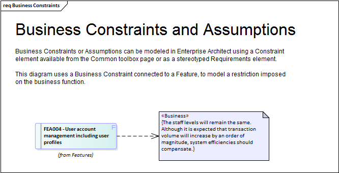 A Business Constraint is a business restriction or limitation imposed on the choices that can be made for the design, implementation or deployment of the solution. They are typically restrictions of budget, time and resources, but can be any type of limitation such as the context of the business deployment where the solution must not change the way that branch staff currently work. A Business Constraint might also limit the access or presentation of information such as 'Only the last four digits of a credit card number can be displayed in reports.' There is some overlap with business rules and the analyst should be careful to separate the two notions. Business Constraints can be modeled in Enterprise Architect using a Constraint element available from the Common toolbox page or a stereotyped Requirements element. They can be related to one or more model elements using a Dependency relationship. Constraints can also be created as a property of an element using the element Properties window.