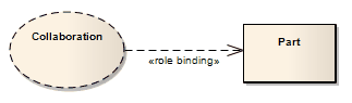 A Role Binding connector is drawn between a Collaboration and the classifier's fulfilling roles, with the Collaboration's internal binding roles labeled on the classifier end of the connector.