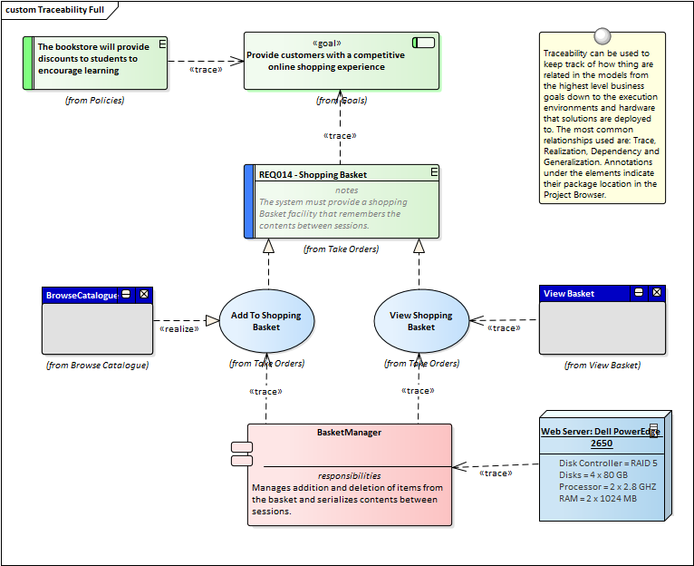 Most requirements processes mandate that requirements are traced from high level concepts such as Business Drivers, Visions and Goals down to the parts of Components that implement them. For many projects this is an intractable problem because much of the information lives in a set of heterogeneous tools such as word processor documents, spread sheets, diagram tools, corporate presentation tools and more. Some project managers attempt to solve the problem by creating a spread sheet that acts as a register of all the disparate information but the management of this file takes up considerable project resources and is almost impossible to keep up to date. With Enterprise Architect there is the ability to model all of this project information in the one tool and to create easy to maintain and analyzable traces between all the elements from an organization's mission statement right down to the level of programming code if required.