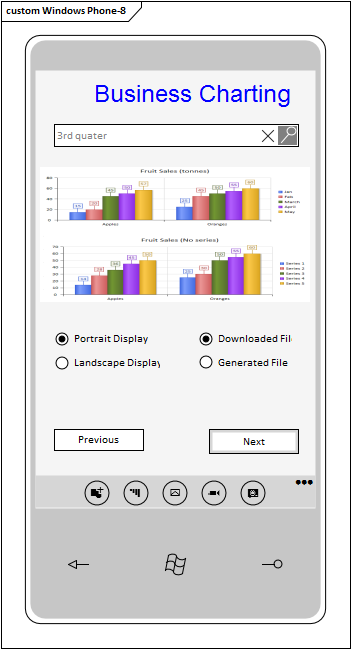 Generates a frame with a screen area for the Windows 8 Phone device. A prompt displays in which you specify portrait or landscape orientation. Elements created within the screen area cannot be resized or moved to sit outside the borders of the screen. Elements created outside the frame can be dragged onto and off the frame, and can be as large as the view or element properties permit. |