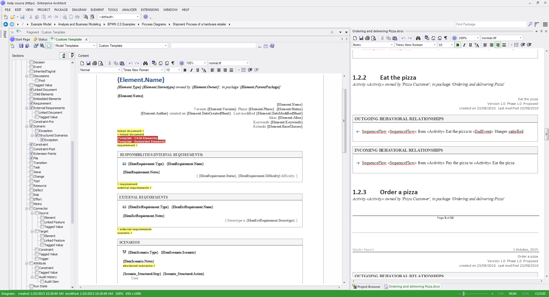 Enterprise Architect has a sophisticated and flexible documentation engine that helps you to create and disseminate high quality and fully customizable documentation directly from the model, in document or web page format. A fundamental reason for constructing models is to communicate ideas and concepts, and to create a shared view of a system or process. While many users will be able to view the models inside Enterprise Architect, there are circumstances where screen viewable or printed documentation is required. Model driven document generation is a powerful productivity tool because when a model is changed the documentation can be automatically regenerated, saving time and resources and reducing the possibility of errors. The carefully crafted and versatile built-in templates help you to generate high quality documentation out-of-the-box.