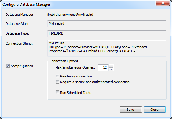Read-only display showing the DBMS of the database, such as Firebird, MySQL, Postgres, SQLSvr or Oracle. |