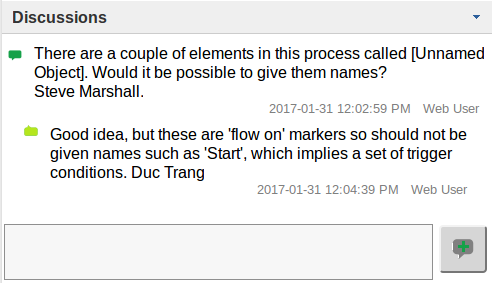 Enterprise Architect has a discussion facility through which users can send short messages to have a quick discussion with other users on a specific element or Package. As a WebEA user, and depending on whether you have access permissions to view or add discussion messages, you can also read and participate in these discussions. The facility is very useful in reviews, as you can comment or respond immediately on a specific point as you come across it, without having to collate a list of comments and compose a relatively long document or email, or schedule a telephone call.