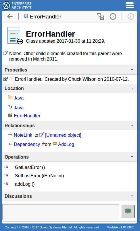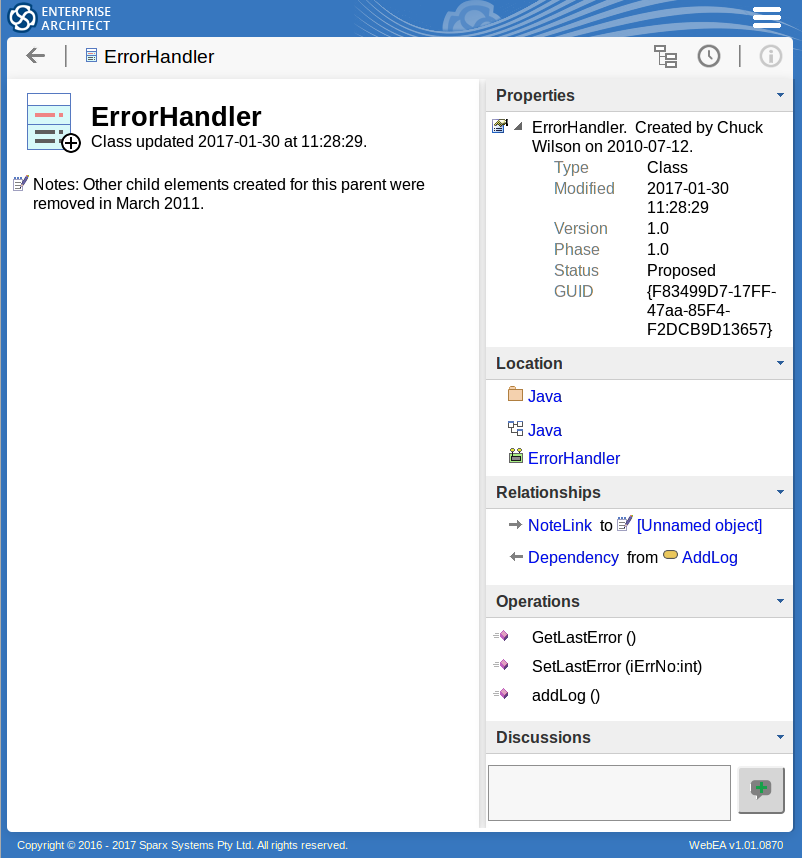 The last panel in the Properties for an element is the 'Discussions' panel, in which you can read and contribute to discussions on the current object. For further information on this facility, see the Discussions in WebEA Help topic.