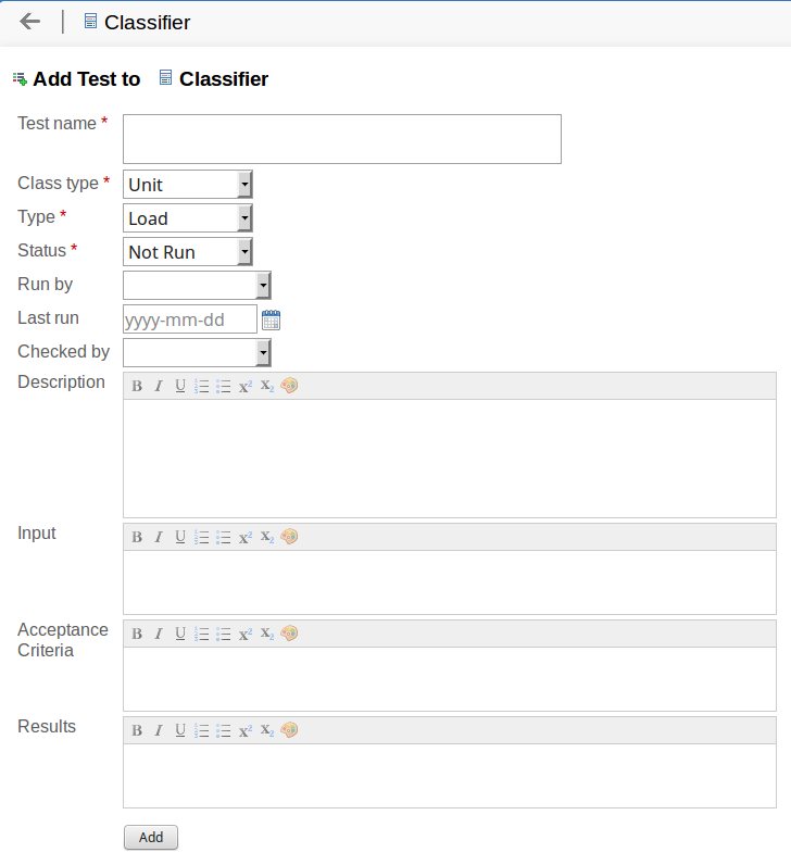 Click on this button to submit the details and create the Test record on the selected element. This message is displayed: Test <name> was successfully added to <element name>. Either: