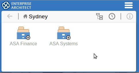 Click on this icon to display a history of the items (Packages, elements and diagrams) you have opened, in the sequence in which you opened them. You can click on an object anywhere in the list to immediately return to that object. (At root node level, just shows the model name.) Note: This history is not related to your browser history. This history is the only thing accessed, and can only be accessed, using the WebEA . |