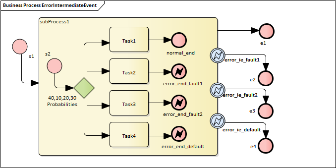 - 11 out of 100 passes finished at error_end_fault1, which triggered error_ie_fault1 by the ErrorRef Fault1, and the exception flowed to e2