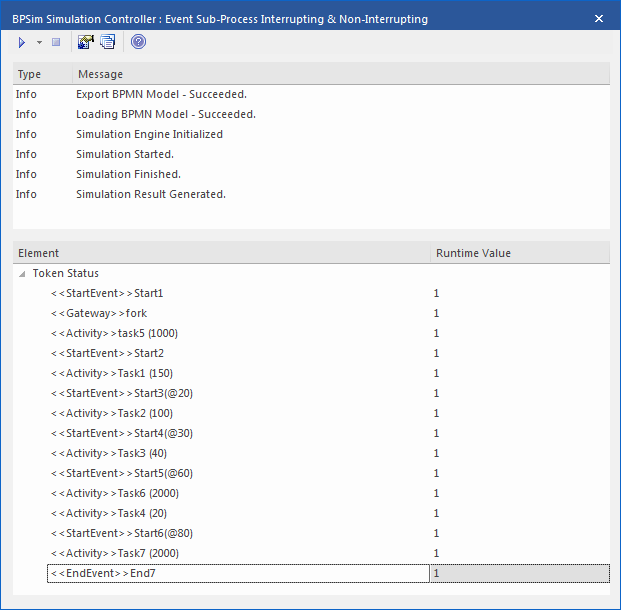 - Event Start4(@30) is Interrupting, it stopped Task1 and Task2 at 30 seconds; it did not affected Task5 because Task5's enclosing process (main process) level is higher than Start4's enclosing Sub-Process (subProcess1)