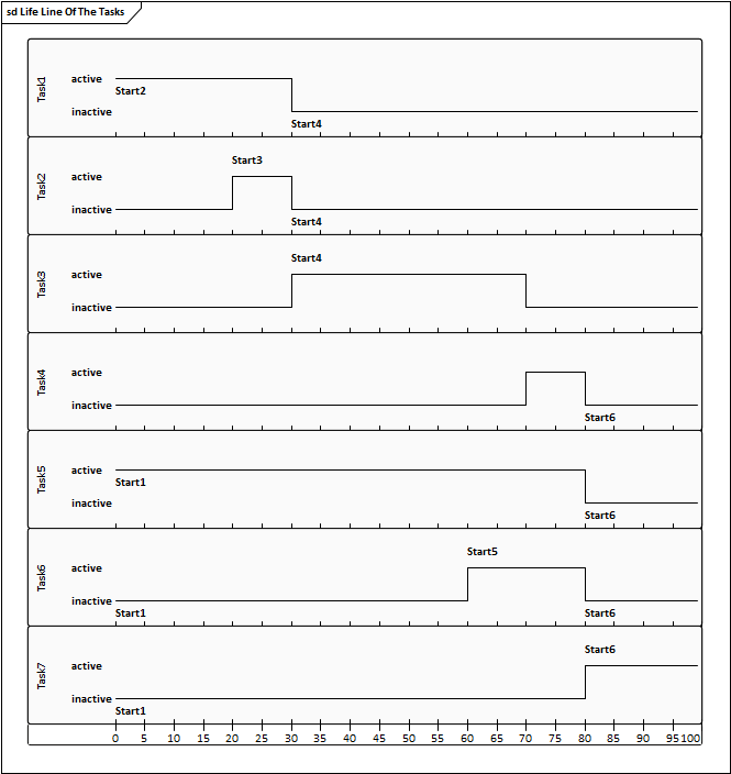 - Event Start6(@80) is Interrupting, it started Task7 at 80 seconds and interrupted the running Tasks (Task4, Task5, Task6) that were in the same or lower level of its enclosing process