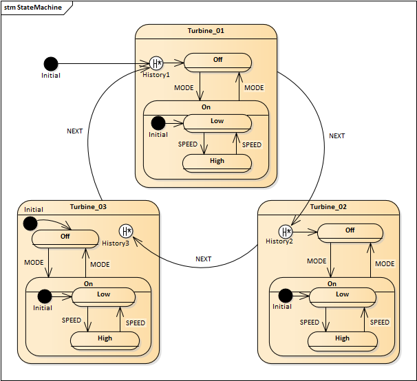 Both StateMachines have three Composite States: Turbine_01, Turbine_02 andTurbine_03, each of which has Off and On States and a History Pseudostate in its Region.