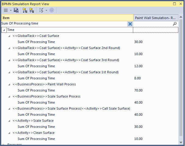 - The Sum Of Processing Time for Paint Wall Process is 70 minutes, composed of the four Call Activities: 40 + 8 + 10 + 12 = 70