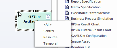 A Business Process Simulation (BPSim) configuration is represented and contained in a Business Process Simulation Artifact element, which you can create on a diagram in any Package in the same project as the BPMN model that you are working with.
