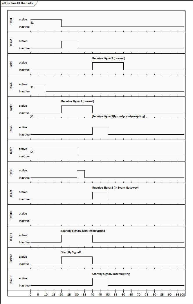 In this example, we demonstrate these Signal Events and their impact on the lifelines of tasks, via BPSim parameter settings.