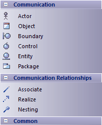 The Communication Toolbox is used to develop Communication diagrams, in which you model dynamic interactions between elements at run-time. These diagrams are used to model workflow and sequential passing of messages between elements in real time; they are often placed beneath Use Case elements to further expand on Use Case behavior over time.