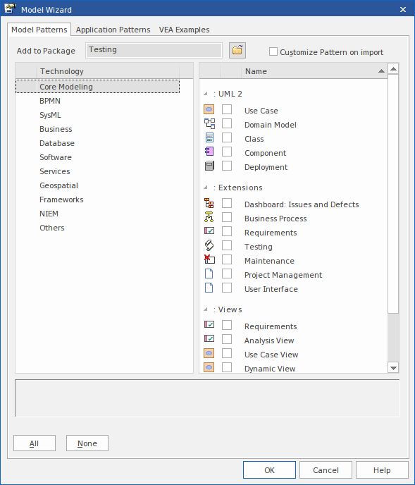 Lists the groups of Model Patterns provided by the selected technology category, and the Pattern templates within each group. For example, the Core Modeling technology category supports the core UML modeling groups: