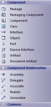 The Component Toolbox provides model elements that you can use to model the physical components of your system in a Component diagram. The Component pages contain elements and connectors related to the actual building of the system - the components that make up the system (such as ActiveX DLLs or Java beans), the Interfaces they expose and the dependencies between those elements.