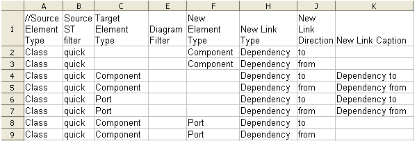 The first row of the example is a comment line identifying the column headings. The subsequent lines define the connector/target element options for a Class element with the stereotype «quick». When a connector is dragged away from an element of this type, you want the user to create a Dependency either to or from a Component element. When they drag a connector onto an existing Port or Component element, you want a Dependency either to or from the Component or, in the case of a Component, you want the user to be able to create an embedded Port element.