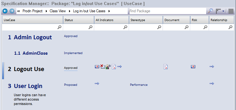 You can also adjust the list header bar to include the columns that show the information of interest to you, and the display bar to further isolate particular elements for review. For an existing Package, the Specification Manager might now resemble this: