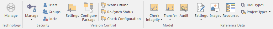 The Configure Ribbon is used for managing the way a repository is used from the setup of reference data, security and version control to audits and integrity checks. Enterprise Architect is a powerful and flexible platform and can be configured to suit any enterprise, business or technical team.