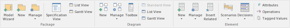 The 'Package' panel provides facilities to create and manage folders (Packages). New models can be added that typically contain a number of other Packages. These Packages form the structure of the model and can be used to group elements, diagrams or other Packages. A Package can also be viewed as a list of elements that will include other Packages, or as a Gantt chart describing the allocation of resources to the elements in the Package. |