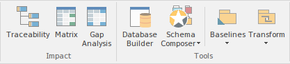 The 'Impact' panel provides a set of tools for viewing how elements are related to each other in the repository. While diagrams provide one way of visualizing the relationships, the Traceability window, the Relationship Matrix and the Gap Analysis Matrix present the information in a compelling and often more appealing format. The matrices allow visual analysis to be performed and they can be exported to Spreadsheets if more detailed analysis is required. |