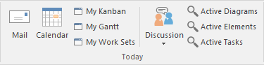 The 'Today' panel provides a convenient collection of the tools that are useful for visualizing what is important in the model right now - that is, today! For any contributor to the repository, there will be things that must be attended to today; these are conveniently brought together, ensuring that you are informed about what you need to attend to, and made aware of information that is important to your role. These tools include Model Mail, which contains messages from other modelers, the Project Calendar listing important events, Gantt Charts listing work allocations, Discussions about elements, Kanban diagrams where tasks are presented, and a number of other facilities.