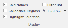 The 'Display' panel provides a range of options that make it possible to tailor the appearance of the Specification Manager view, to better display the information you want to examine. There are options providing visual cues, such as highlighting the selected element and using bold fonts to emphasize element names, as well as options to filter the list of elements that is displayed.