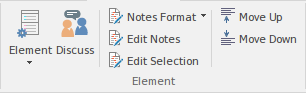 The 'Element' panel brings together a range of facilities for working with the elements that are displayed in the Specification Manager view. There are facilities for adding new elements, and for viewing and editing the Properties of elements, as well as creating, viewing and managing other items associated with the elements, such as Tests, Maintenance items (Defects, Issues, Changes, Tasks and so on), Resource Allocations and Element Discussions.