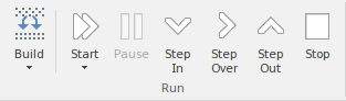 The 'Run' panel provides a set of buttons for building and running an application that is being analyzed. After making modifications to the code base, you can simply click on 'Build', then click on buttons to begin execution of the updated application, pausing or stepping through code as required.
