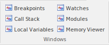 The 'Windows' panel provides access to a suite of windows associated with the debugging process, each of which provides information on an aspect of the application being debugged, particularly at a breakpoint.