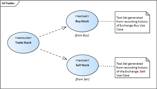 The first task on a Test domain diagram is to create the Use Cases (Test Sets). These define this particular domain's responsibility. The Diagram Toolbox and shortcut menu provide Artifacts to help you achieve this. The first of these is the Test Cut and this is used in the next step; identifying those methods (from the class model) that you consider to be participants in the Use Case. The Test Cut Artifact is useful because its allows us to partition a Class, selecting only those methods which are relevant. Test Cuts can be run individually or link to one or more Test Sets. Test Sets in turn can be linked to one or more Test Suites. In any case, any element of the Test domain tree can be run individually or as a whole.