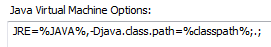 The JRE parameter must point to the installation folder for the Java JDK. A JDK installation is necessary for debugging to succeed. The JRE should not point to the installation of the public Java Runtime Environment, if that is installed. Environment variables can be used when specifying the VM startup options, such as classpath. For example, using: