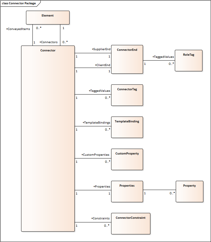This diagram shows the Connector Class, its collections and its relationships to the Element Class. Association Target roles correspond to member variable names in the source interface. The associated Classes represent the object type used in each collection.