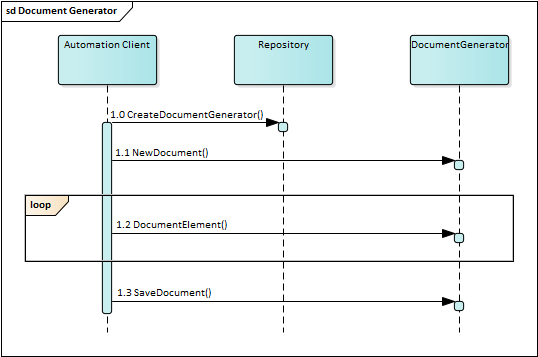 This diagram illustrates how you might use the Document Generator interface in generating a report through the Automation Interface.