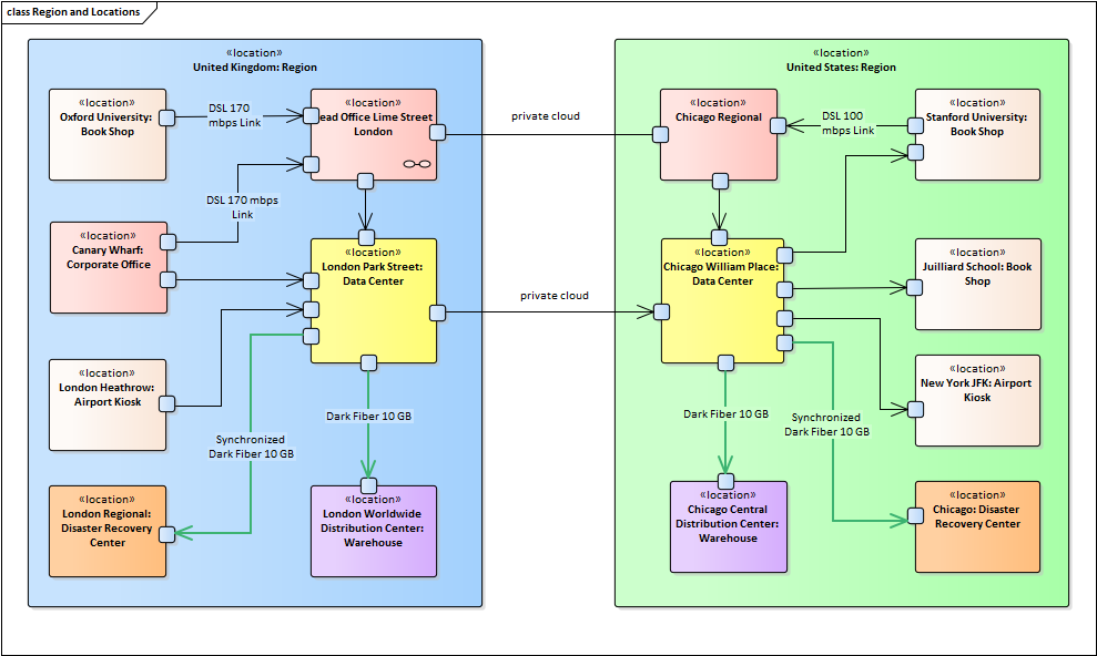 Enterprise Architect provides a wide range of tools for modeling locations at all levels, and this is particularly true at an infrastructure level. The same elements that are used to model the business locations can be augmented to create expressive models that represent how the infrastructure relates to facilities, including high level models of the communication fabric between different locations and the protocols used. Unified Modeling Language Ports allow drill-down to the internal structure of a facility. For example, a high level diagram might describe the communication path between a corporate office and a data center using a Port on the boundary of each facility. A child diagram could then describe the routers, switches, servers, and other infrastructure elements that make up the data center or corporate office.