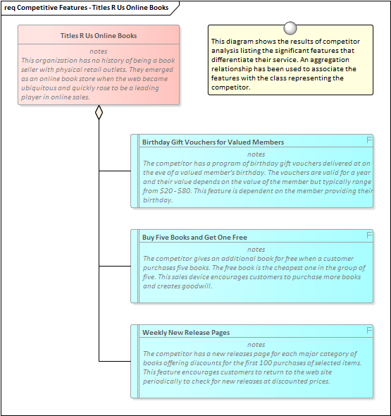 Enterprise Architect is a flexible platform that can be used to assist the analyst with both Benchmarking and Market Analysis, as it has convenient tools for recording research findings and has the ability to express these in diagrams and documentation generated from the model. Request for Information (RFI) documents could be generated directly from the model and the powerful Relationship Matrix can be used to demonstrate gaps between current and best practice.