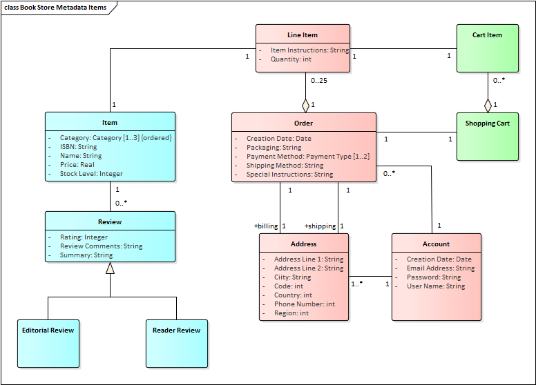 A Class Diagram can be used to model important data elements in the domain. The elements are modeled using UML Classes and Names, Aliases, Descriptions and other details such as Attributes can be entered for each Class. The elements can be related to each other using relationships such as the Association and Generalization. These elements can then be used throughout the model as a data dictionary, including in element notes where they can be referenced.