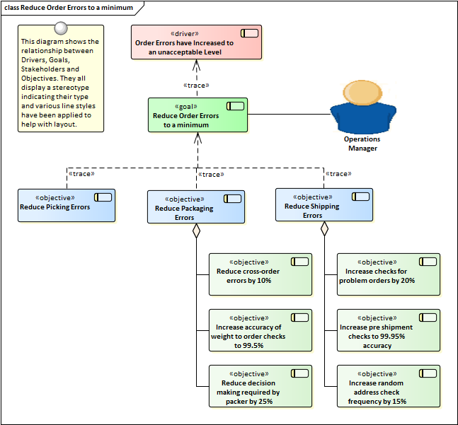 Enterprise Architect can be used to model the Goals and Objectives and relate them to each other, with each Goal being decomposed into a number of Objectives that can be measured. Stereotypes can be used to create Goal and Objective elements, and these can be added to any number of diagrams. The Project Browser provides a way of structuring the Goals, adding the Objectives as child elements placed under the applicable Goal. The Specification Manager is a useful tool for creating, viewing or presenting the Goals and Objectives in a workshop. It is a text based tool and allows the Goals and Objectives to be viewed in a word processor or spreadsheet interface.