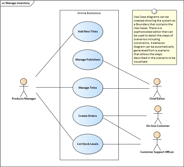 The Use Case Diagram is a simple and powerful way of describing the goals the users of a system (or entity) want to achieve. It describes who wants to achieve a particular goal but not how the goal will be delivered. Use Case diagrams can be simple or structured and relationships such as Include, Extend and Generalization can be added to refine the model. A system (or entity) boundary can be added with a descriptive name showing clearly that Use Cases reside inside the system and Actors outside.