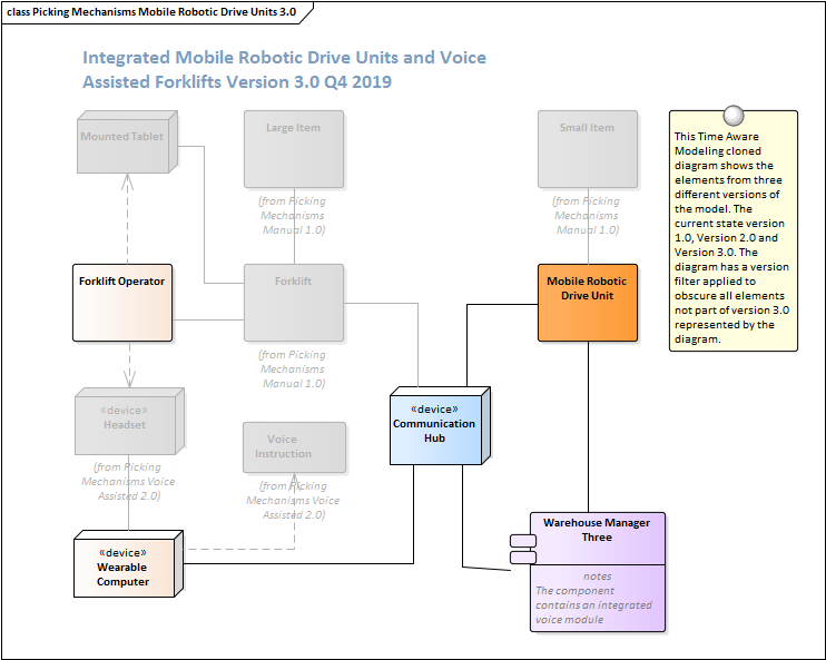 Time Aware Modeling is a powerful and expressive technique for defining and visualizing how models change over time. The technique allows different versions or states of a model to be created to represent how the model will change with the passage of time. This includes elements and features that are changed, deleted or added at a point in time. The technique works by allowing a modeler to clone a Package, diagram or element in a model. When this is done, the complex task of maintaining the relationships between previous versions is managed by Enterprise Architect.