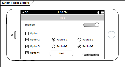These icons each generate a frame for the device type you have selected. A prompt displays for you to specify portrait or landscape orientation. (The main illustration shows a landscape iPhone 5s frame and a portrait iPhone 4s frame.) Tagged Values: