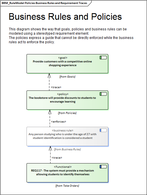 A policy is a high level principle or statement of intent typically defined and managed by a governance body and a Business Rule is an implementation of the Policy. They are not strictly requirements and are often defined at the enterprise level rather than the project level which facilitates their reuse across multiple projects. Policies and Business Rules can be modeled using stereotyped requirement elements and business and system requirements can be traced to them from individual projects. There is some overlap with regulatory and safety requirements which some methods consider to be types of Business Rules. Enterprise Architect supports the modeling of Polices and Business Rules by using stereotyped requirements but also has a powerful Business Rule Modeling capability that can create executable code for a variety of languages.