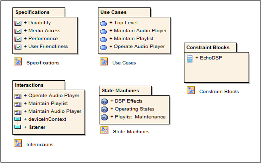 The SysML Requirements Model provides the system requirements, the expected abstract behavior and the operating constraints that the designed system must conform to. This diagram shows an example requirements model for a Portable Audio Player.