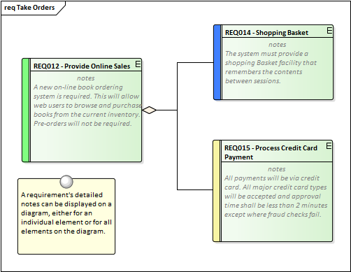 Shows the arrangement of a group of Requirements and other elements, and can show whether the elements are in the same Package or different Packages. It is a powerful way of presenting requirements information because connectors can be created to show how the a Requirement relates to other elements in the Repository including other Requirements.