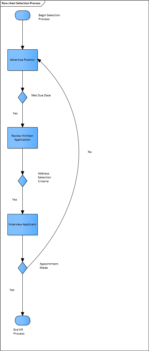- Create a Process called Interview Applicant'. Draw a Connector from 'Address Selection Criteria' to 'Interview Applicant' and label the Connector 'Yes' denoting that if the applicant has addressed the selection criteria then proceed to 'Interview Applicant'.