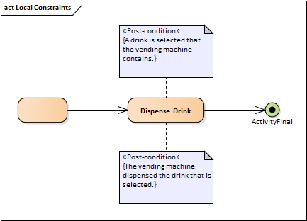 Actions can be further defined with pre-condition and post-condition notes, which constrain an Action's entry and exit.