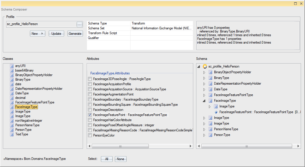 Our request message specifies that it will send a facial image to be used for facial recognition. To do that, we need to subset the appropriate types from the Biometrics Package. Start by locating the type FaceImageType in the Domains\Biom package within the NIEM 3.1 Reference Model. Drag this type into the Schema Composer. The super types from which this type inherits are automatically added to the Schema Composer.