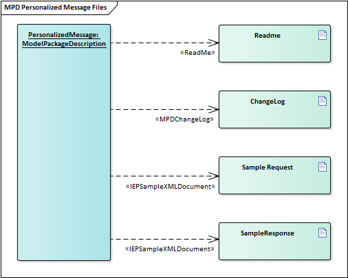 All IEPD Packages are expected by NIEM to contain - at a minimum - a change log and a readme, but there are several other types of artifact that are also supported. In Enterprise Architect, each is defined using a stereotyped relationship to an Artifact. As with the Package use described above, the relationship specifies where the file will be located. In this image a ReadMe, ChangeLog and a sample document for each of the document types are described. This will add information about those files to the target catalog file. The files will not be created by Enterprise Architect, and their content is beyond the scope of this tutorial.