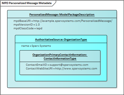 The top level object in the Pattern is an instance of the ModelPackageDescription Class. The name of the MPD is the name of the Object itself. All other properties are in the Run-State of the object. This figure shows how the MPD might look after providing real information.