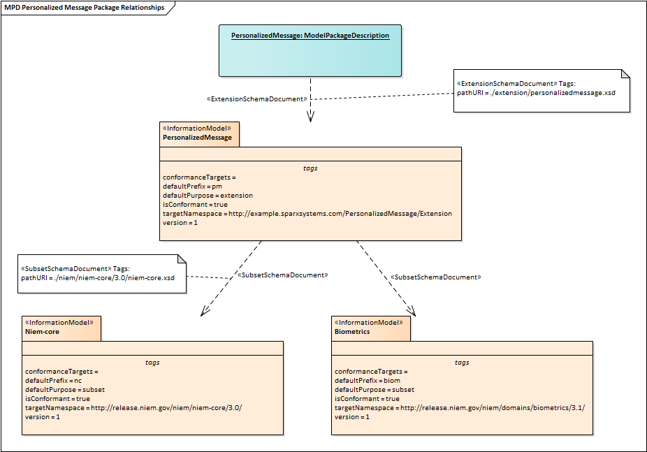 The relationships connecting the Model Package Description to the Information Models specify which schema files are to be generated with this MPD. In this example, we will use types from two different NIEM namespaces. To do this, we first create an InformationModel Package for each, where the Namespace Tagged Values match the original, and the purpose is set to subset. We will also need an extension Package where we can define our own types and how the NIEM types will be used. This figure shows how this will look: